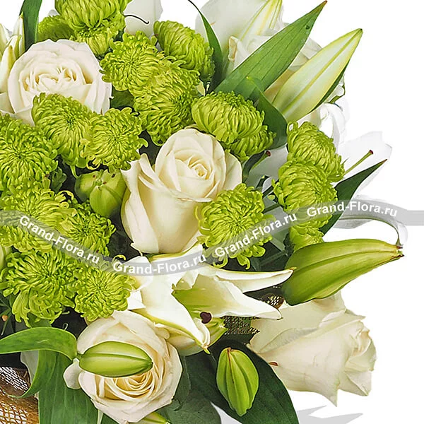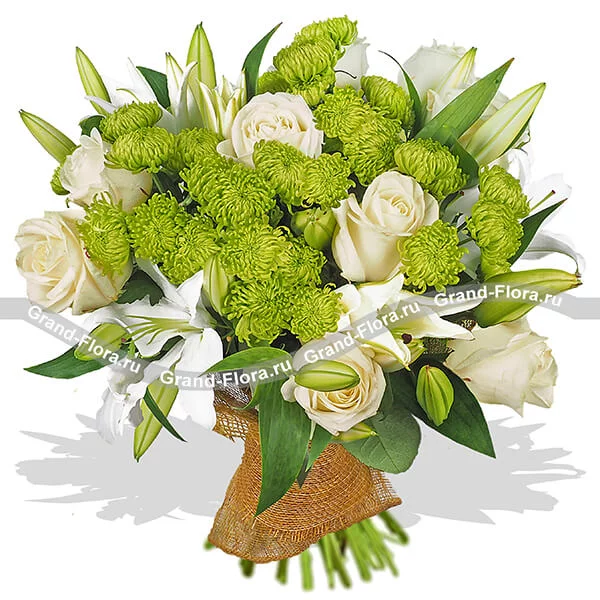 Стандартный: роза белая - 5 шт., лилия белая - 2 шт., хризантема одноголовая зеленая (шамрок) - 7 шт., сетка коричневая.