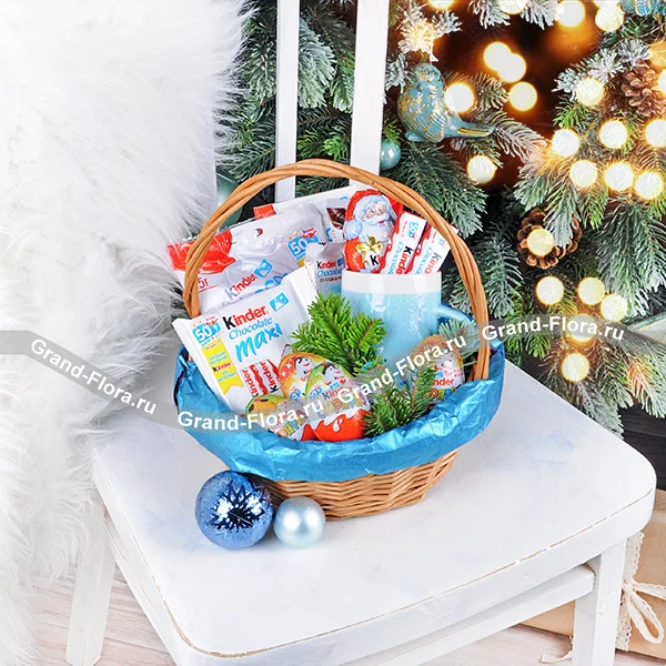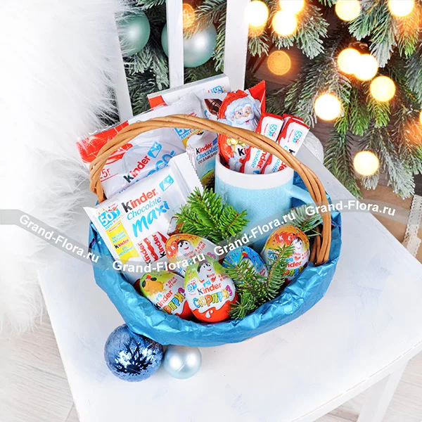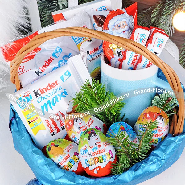 киндер "Maxi" - 84 г., киндер "Choco-Bons" - 125 г., киндер "Bueno" - 43 г., киндер "Сюрприз" - 4 шт., киндер "Дед Мороз" - 110 г., киндер "chocolate maxi" - 2 шт., киндер со злаками - 23,5 г., кружка - 1 шт., ель, декор, корзина малая.
